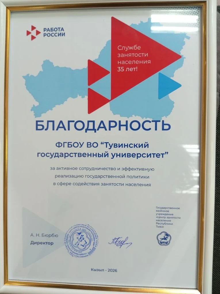 Партнер ТувГУ — Центр занятости населения Республики Тыва — отметил свой 35-летний юбилей. За годы работы Центр стал ключевым звеном в развитии рынка труда региона, помогая тысячам граждан найти свое призвание, а работодателям — квалифицированные кадры.В рамках торжественного мероприятия, посвященного юбилею, ТувГУ был удостоен благодарности за активное многолетнее сотрудничество и эффективную реализацию государственной политики в сфере содействия занятости молодежи.Особое признание получила и команда Центра карьеры вуза. Руководитель Центра карьеры ТувГУ Регина Тайбыл была отмечена благодарностью за личный вклад, инициативность и плодотворное взаимодействие в вопросах трудоустройства выпускников.Коллектив ТувГУ искренне поздравляет коллег с праздником! Мы желаем Центру занятости населения процветания, новых профессиональных достижений и надеемся на дальнейшее укрепление наших партнерских отношений на благо молодежи республики.